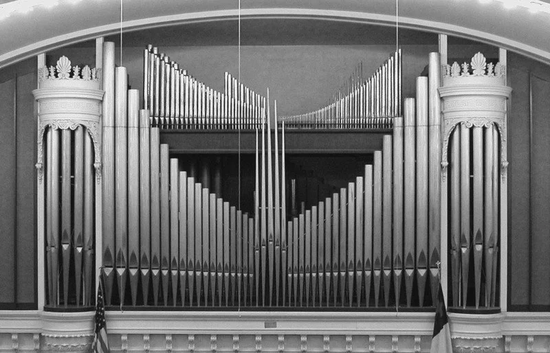 In 1905 when the building was completed, it contained a much smaller organ. In 1910 the front of the Sanctuary was remolded to accommodate the installation of an Austin Pipe Organ with 53 ranks (groups of pipes) comprising 4,500 pipes. Said to be the largest organ west of the Mississippi River, it provided the church with beautiful music and many organ concerts in its span of more than 50 years.